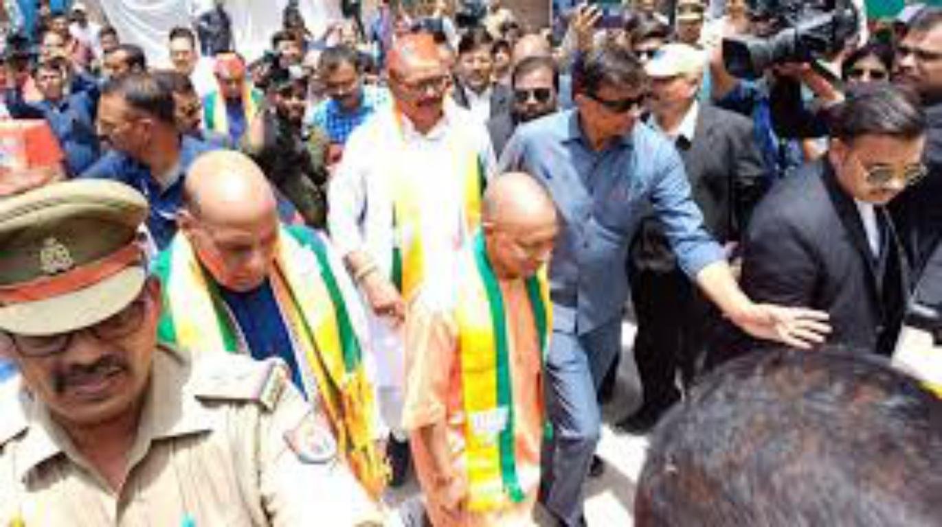 नई दिल्ली। केंद्रीय रक्षा मंत्री और लखनऊ लोकसभा सीट से बीजेपी उम्मीदवार राजनाथ सिंह ने सोमवार को अपना नामांकन पत्र दाखिल किया। इस दौरान यूपी के सीएम योगी आदित्यनाथ, उत्तराखंड के सीएम पुष्कर सिंह धामी भी मौजूद रहे। इससे पहले राजनाथ सिंह ने सीएम योगी, यूपी के डिप्टी सीएम ब्रजेश पाठक और अन्य बीजेपी नेताओं के साथ रोड शो किया।